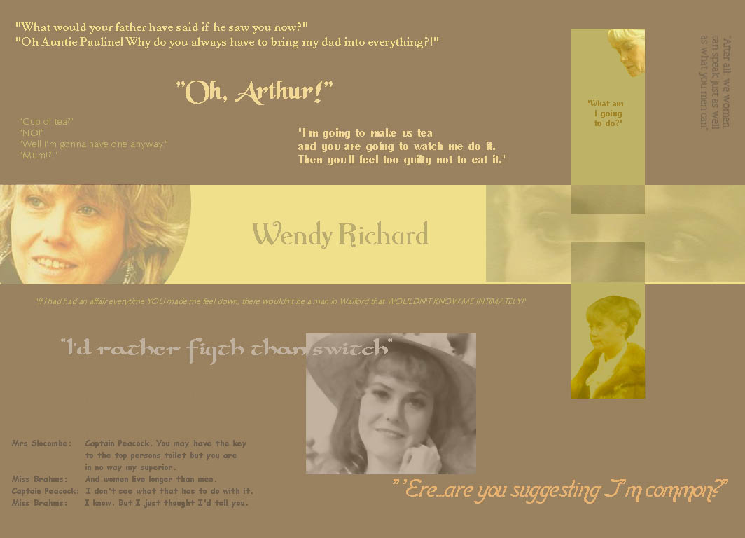 The first Wendy Richard computer wallpaper Size: 1024 x 768 -- and perhaps just a little 'busier' than most PC desktop background images, but, hey, it's the thought that counts, right? The work evolved from a smaller composition which I pieced together while familiarizing myself with Ulead PhotoImpact. |