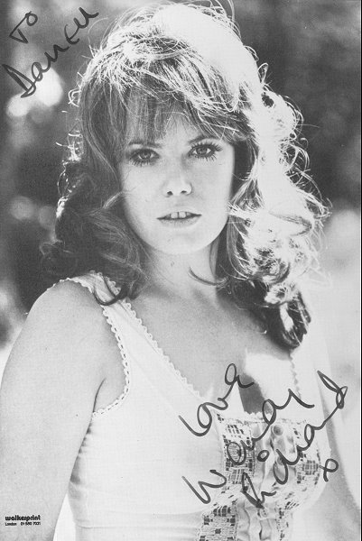The previous owner of this quite attractive card said that Wendy sent it to him in 1980. Wendy told me it was a publicity photo from 1974 of her on Hampstead Heath (a large park on the north side of London). |