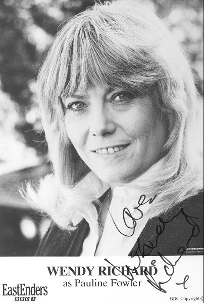 This somewhat stern image was Wendy's BBC EastEnders publicity card for 1999. She remarked to me that her character appears so unusually stylish here because she was asked to shoot it on short notice while simply visiting the Elstree set that morning. She also appears attired like this in an all-cast photo done that same day. |