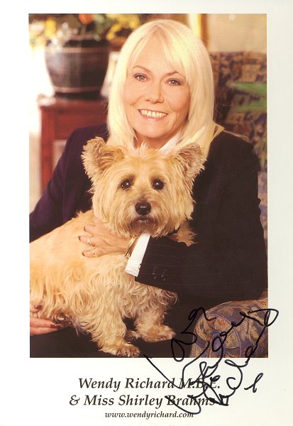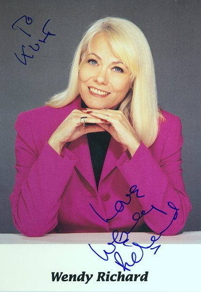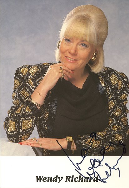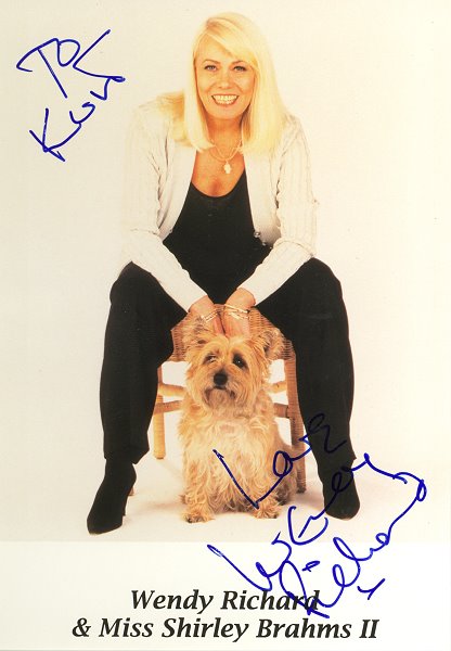 A BBC card for Wendy's reprise role of Shirley Brahms. Note that Miss Brahms never actually wore this eye-catching outfit in any of the aired episodes; it was in fact Wendy's own dress. |