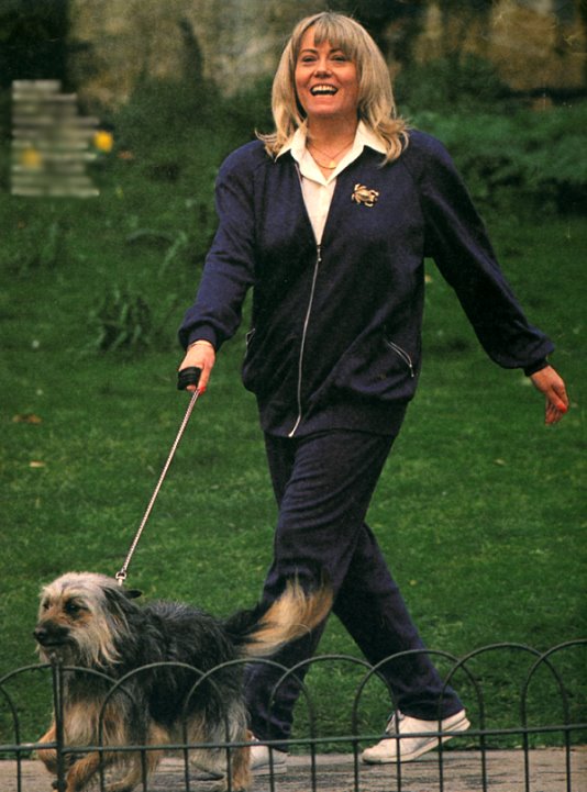 A nice -- and very casual -- snap of Wendy out walking a dog (though it's not hers!) in Regent's Park, London. Exact date of the photo is unknown, but it appeared in the Sunday Mirror Magazine sometime in 1988. |