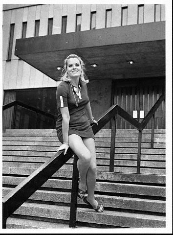 Wendy, wearing a ribbed-pattern sweater, in a press photo taken outside on the street around 1972, when she seemed to be doing most of her work for the London Weekend television production company. |