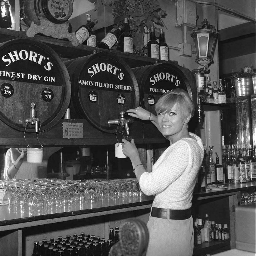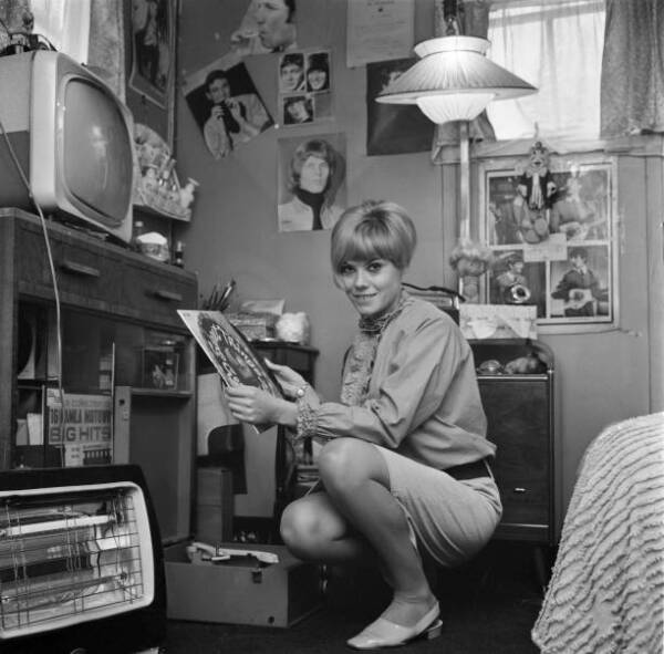 A quartet of related pictures from the time before acting became her full-time profession, when 23-year-old Wendy made ends meet by also working behind the bar of a London pub. All these shots are from a series done in May 1966 as publicity for her appearance on the television series Weavers Green. But whereas a number of other photos show Wendy in character for the show (and so appear in the 1966 room of the Gallery), these four photos give a good idea of her fashionable hip look in real life. A few things worth noticing: