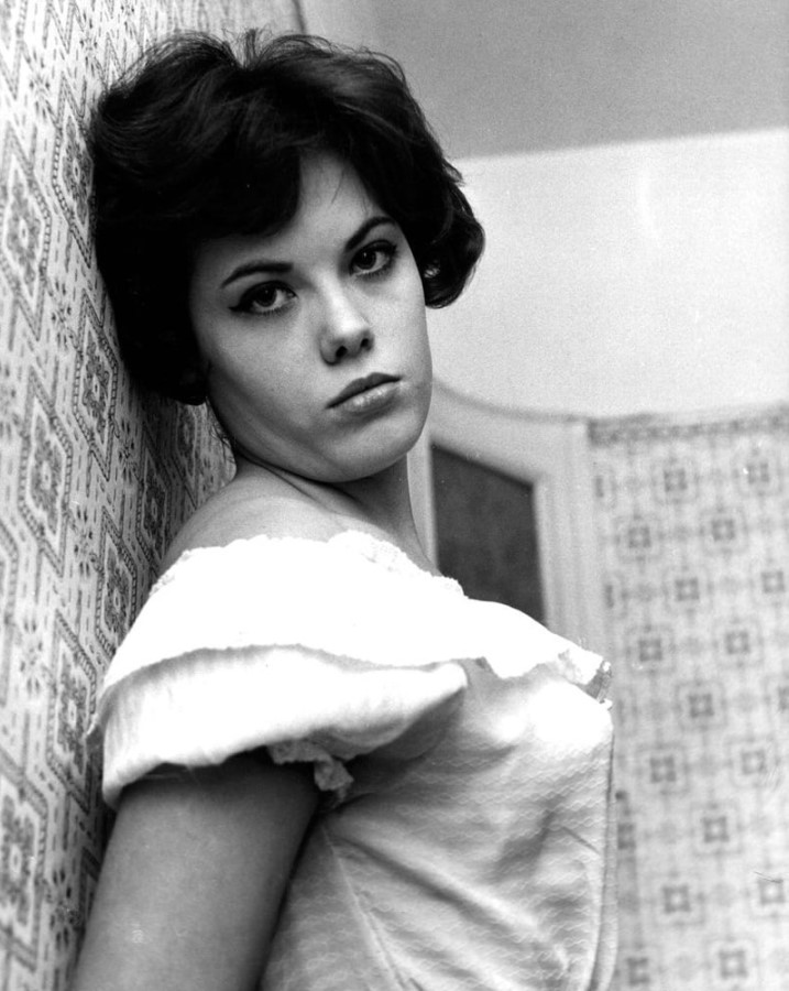 Another of the large number of portrait photos done of Wendy, in late '62 or early '63 (possibly as part of a promotion for Harpers West One), and shot in the breakfast room of her mother's London B&B. The tatty background was unimportant; it would be removed or closely cropped by a publication prior to using the photo. Note the metal barstool is the same that Wendy used for other contemporary shots (such as this one), as is the dark velour dress she's wearing. |