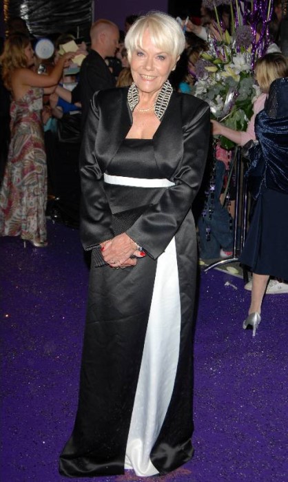A shot from the British Soap Awards event in May of 2002 illustrates excellently Wendy's look of the early-2000s. Note the autograph pad in hand, MBE pin on the left jacket breast, and glimpse of the Union Jack handbag below her right arm. |