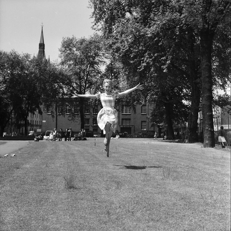 Exuberant Wendy! A delightful action shot from the series of outdoor photos, June 1962. Wendy here is in Argyle Square (with the spire of St. Pancras train station visible behind her above the trees); she's kicked off her shoes to the left by the path and has taken to the air, while some people in the distance watch. The brick building at the far end of the square is still there in 2020, though it's a self-storage facility now. The wooden benches have been replaced by metal ones. And about where those people are sitting on the lawn is now a basketball court across the width of the square. The second (right) image is a lovely close-up of Wendy's feat of levitation. |