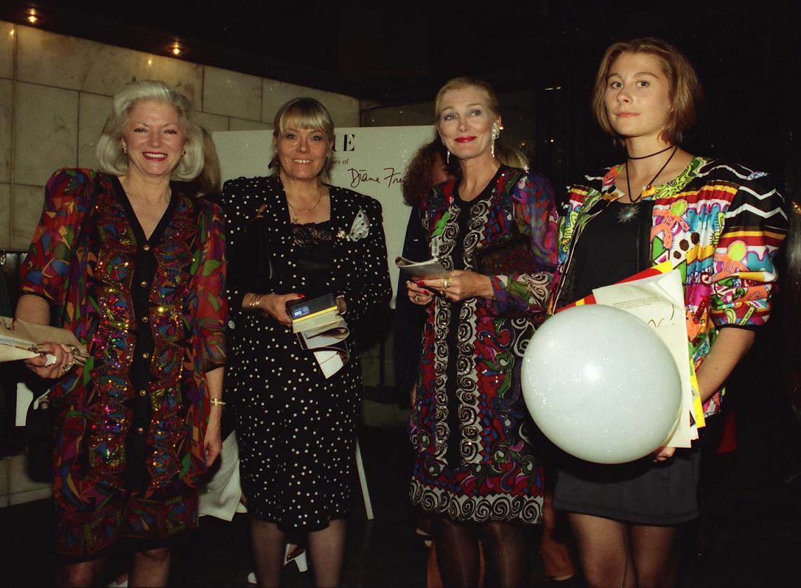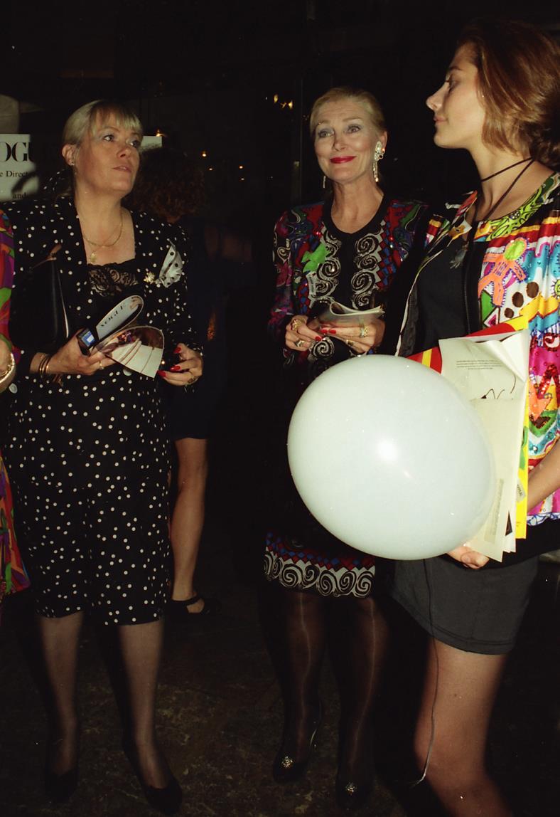 These three images are from a strip of negatives shot at what appears to be an event sponsored by Vogue (magazine) along with Selfridges department store and the fashion designer Diane Freis. No more details are known, including the identity of the other ladies; however, from Wendy's appearance, this event likely took place some time in the very late 1980s or early 1990s. Why the young lady on the right seems to be carrying a large circular lighting fixture remains a mystery. |
