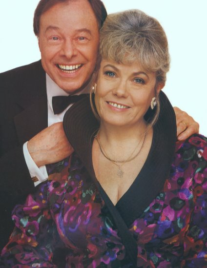 With the late Frankie Vaughan, CBE, a famous singer. This photo was evidently from a Variety Club dinner in 1998, the year before Vaughan passed away. Note Wendy's corsage: it's an interesting combination of Variety Club golden hearts with what appear to be an oak leave and poppy blossom. If so, this may signify the event occured late in the year, a few weeks before Remembrance Day. |