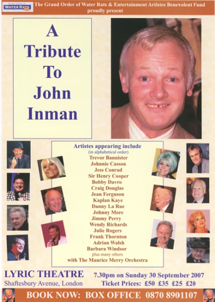 Despite the name, this was not the same production as the television special which Wendy had been the presenter for in March of 2007, shortly after John Inman (a close friend of Wendy's) passed away. Rather, this tribute production was a one-time theatrical stage event which took place the evening of 30 Sep 07 at the Lyric Theatre, in London's West End. The proceeds from the event went to two charities: the Grand Order of Water Rats and the Entertainment Artists Benevolent Fund. Here is a handbill from the show. Judging by the review offered (archived link) over on the (now defunct) Gracebrothers.net website, Wendy's role during the show appears to have been mostly as a presenter or introducer for various other performing artists.