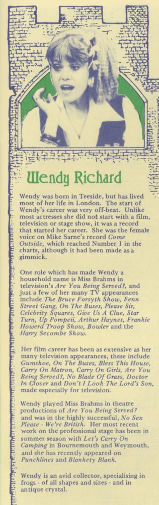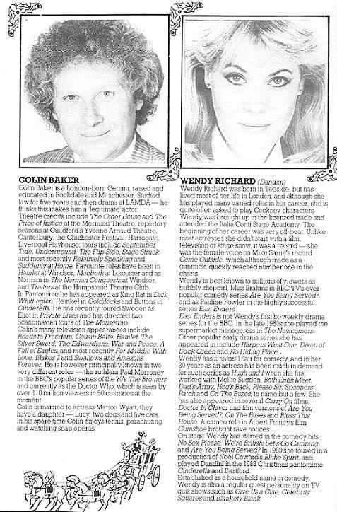 Christmas season, 1986/87 -- Brighton, East Sussex. Wendy did a run at the Theatre Royal, Brighton, from Friday, 12 Dec 86 through Saturday, 10 Jan 87, for two performances a day, including New Year's Eve. The production was written and directed by John Nathan-Turner. Ms. Richard shared top billing with Colin Baker (of Dr.Who fame). Hugh Lloyd, with whom she'd worked years before on Hugh and I, also appeared in this production. There are additional snaps of Wendy in-costume in the 1986 room of the Gallery. |