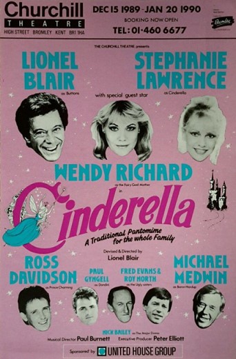 Wendy participated in this venerable and popular English Christmas-time tradition many times, beginning with the Christmas season of 1983. Her role in panto productions of Cinderella was nearly always as Dandini, the Prince's valet and best friend (though one year, 1989, she played the Fairy Godmother instead). Her appearances included: